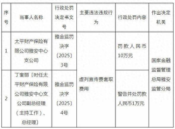 日前,国家金融监督管理总局雅安监管分局披露的行政处罚信息公开表显示,因虚列宣传费套取费用,太平财产保险有限公司雅安中心支公司被罚款10万元。