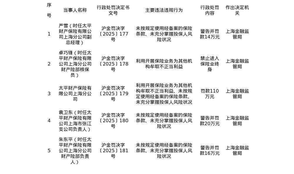 此前,国家金融监督管理总局上海监管局对太平财产保险有限公司上海分公司及相关责任人开出了5张罚单。